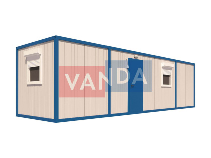 Данный контейнер не требует обустройства тяжеловесного фундамента, поскольку постройка легкая и устойчивая. Данный блок-контейнер может быть выполнен абсолютно любого размера и формы по эскизу заказчика.Контейнер состоит из металлического сварного основания. Стены изготовлены из сэндвич-панелей с прокладкой утеплителя. Крыша покрыта крашенным холоднокатаным металлом 1,2 мм. Помещение обустроено пароизоляцией при помощи технической пленки, которая проложена на полу и потолке. Внутренняя облицовка потолка выполнена из ПВХ-панелей, пол – из шпунтованной доски. Вход в помещение оборудован запирающейся металлической дверью.